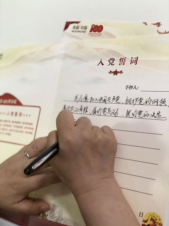 觀看結(jié)束后,每位黨員都激情澎湃。與此同時,美淼控股黨支部開展“ 手抄入黨誓詞 向黨說句心里話”主題黨日活動,獻禮黨的百年華誕,每名黨員在紙上鄭重抄寫入黨誓詞,用心書寫每一個筆畫、每一個漢字。并宣讀“向黨說句心里話”。以向黨說句心里話的方式,表達對黨百歲生日的深情祝福,抒發(fā)對黨的深厚情感,展現(xiàn)愛黨愛國、愛崗敬業(yè)、無私奉獻的良好精神風(fēng)貌。